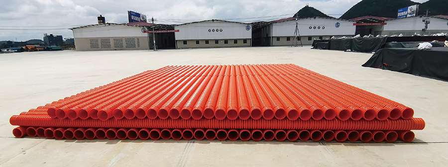 5、抗弯曲性能好:管材为双壁结构,抗弯曲强度高,同时因不需管枕,与相邻管材为紧密接触,之间不存在空隙,因此,管材在施工时不易出现蛇形管,有利于后期穿缆;